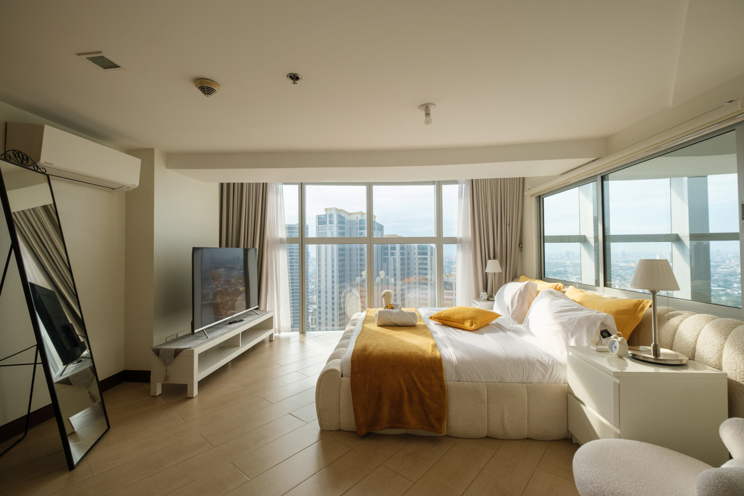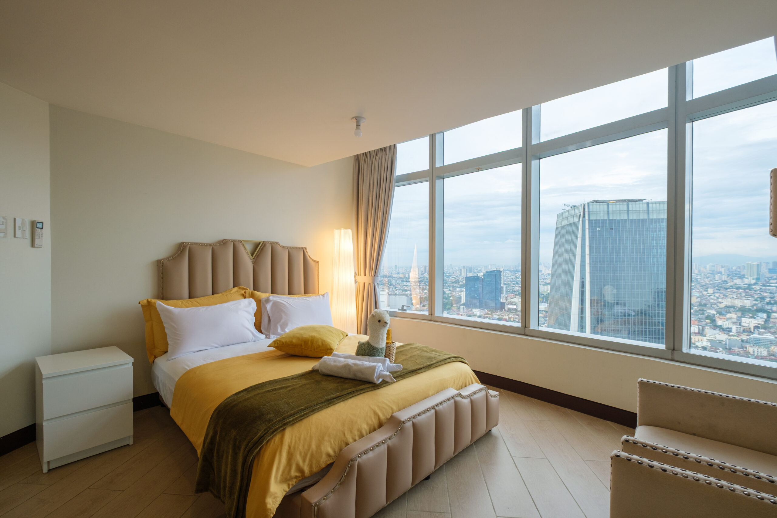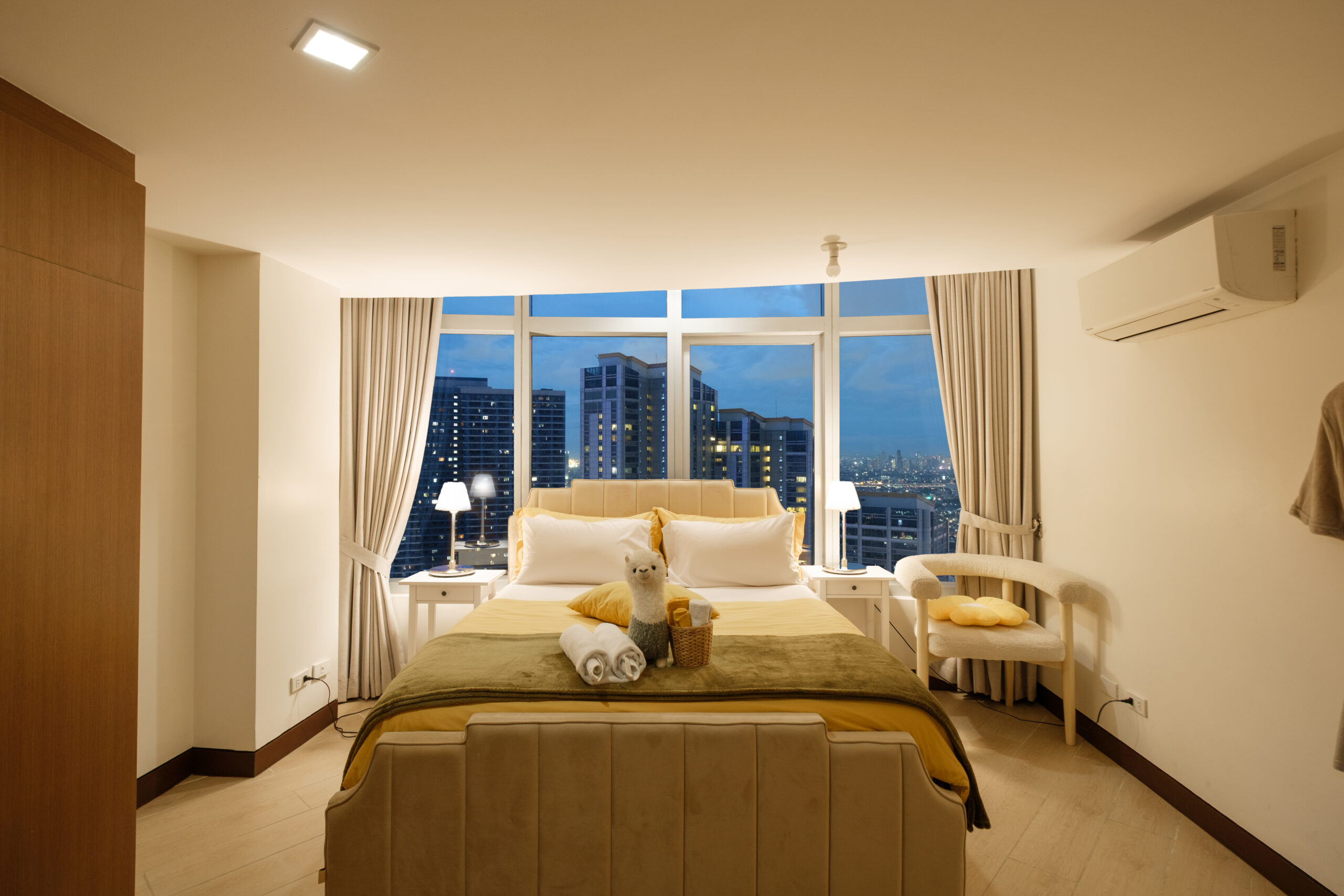 The Master Suite is a haven of luxury, featuring a California King size bed, a dedicated vanity area, a Dyson hairdryer, and a panoramic view that stretches across the city.